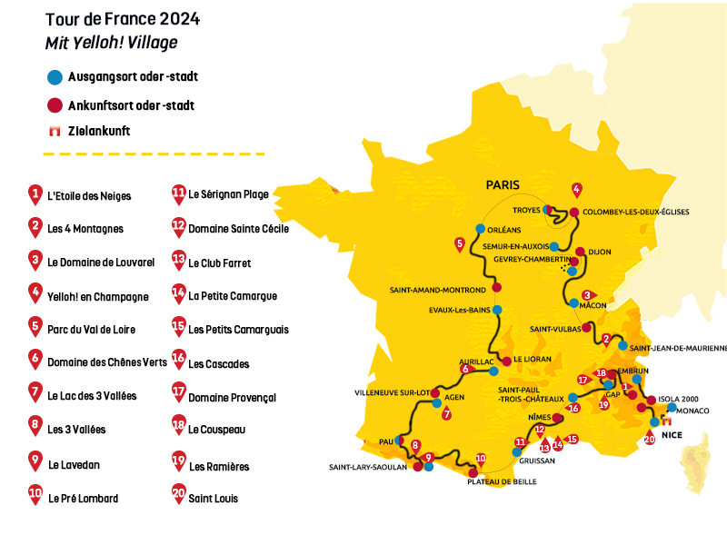 In diesem Jahr führt die Tour de France ganz in der Nähe zahlreicher Campingdörfer Yelloh! Village vorbei. Vom 29. Juni bis zum 21. Juli 2024 können Sie den Radsportlern zujubeln und am Straßenrand den mitreißenden Sog dieser großen, sehr populären Wettfahrt spüren!